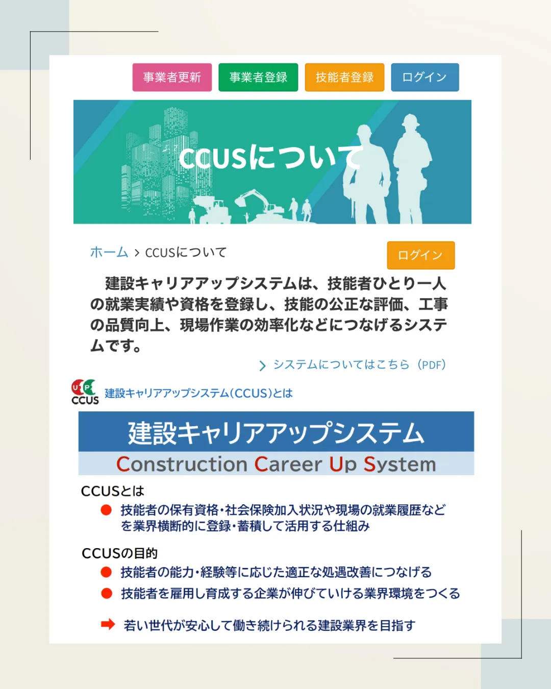 建設技能者向けのシステムで、技能者の就業履歴や資格情報を登録・管理し、技能の評価や処遇改善、人材育成に役立てることを目的としています✨️